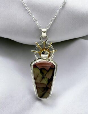 Then, I took my work to the third dimension in Metal Clay. Silver clay is silver in a polymer that is moldable, sculptable silver, and after it is kiln-fired, it becomes fine silver (.999) or .960 silver. I fashion one of a kind pieces that compliment pictures I see in the stones I cut. Generally, my Metal Clay work consists of sculptured, realistic flowers, vines and trees, but I sometimes incorporate dragons, fairies and stars.