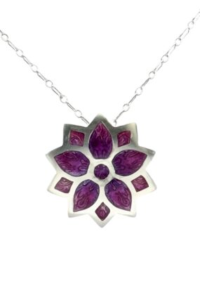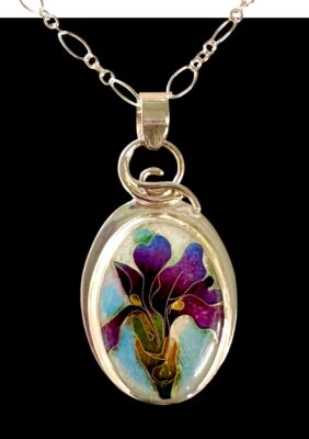 Then, I learned Cloisonné! The brilliant colors available in leaded enamel gave me new inspiration. I capture the fleeting beauty of the flowers in my floral cloisonné. Landscapes, birds, butterflies and fish have also inspired colorful pieces. I set my cloisonné in sterling silver filigree or complimentary Silver Clay settings. Please visit my website often for the ever-changing collections in each Media.
